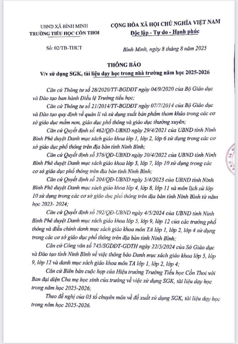 Thông báo về việc sử dụng SGK, tài liệu dạy học trong nhà trường năm học 2025-2026