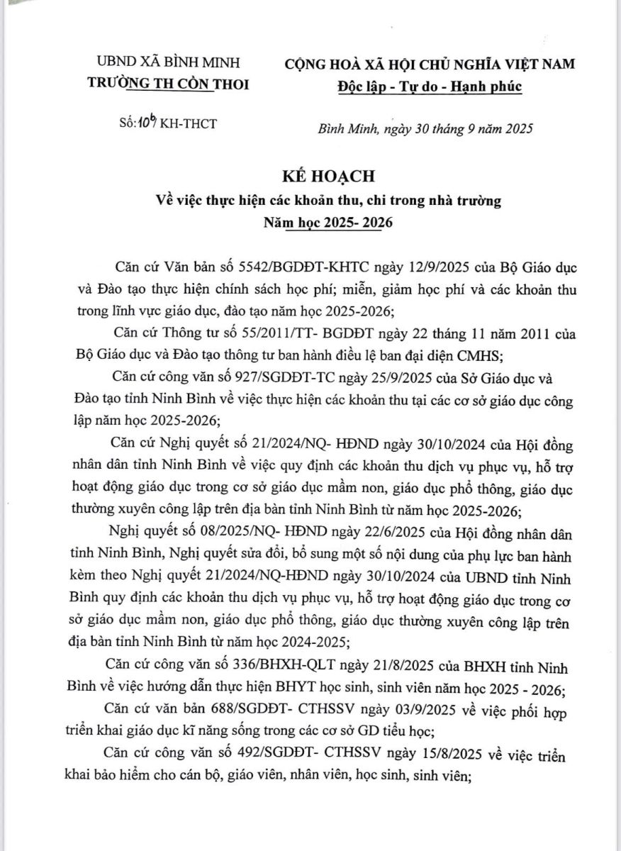 TRƯỜNG TIỂU HỌC CỒN THOI BÁO CÁO CÁC KHOẢN THU NĂM HỌC 2025 -2026